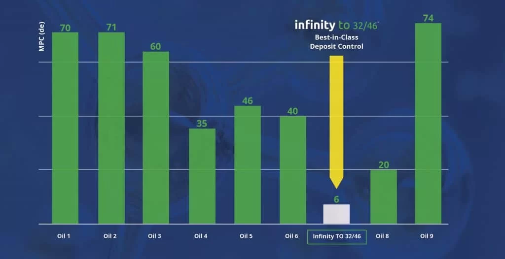 In addition to attaining the “1000 Solutions Challenge” award, Infinity TO has the best in class deposit control. As seen in the figure below, Infinity TO outperforms the competitive formulations in the market. Due to its proprietary additive system, it can capture and neutralize degradation products. This ensures that these products never have a chance to be formed in the first place! Infinity TO eliminates the need for any varnish mitigation technology and will allow your operation to sustain a long, healthy, virtually varnish free life for the machine.