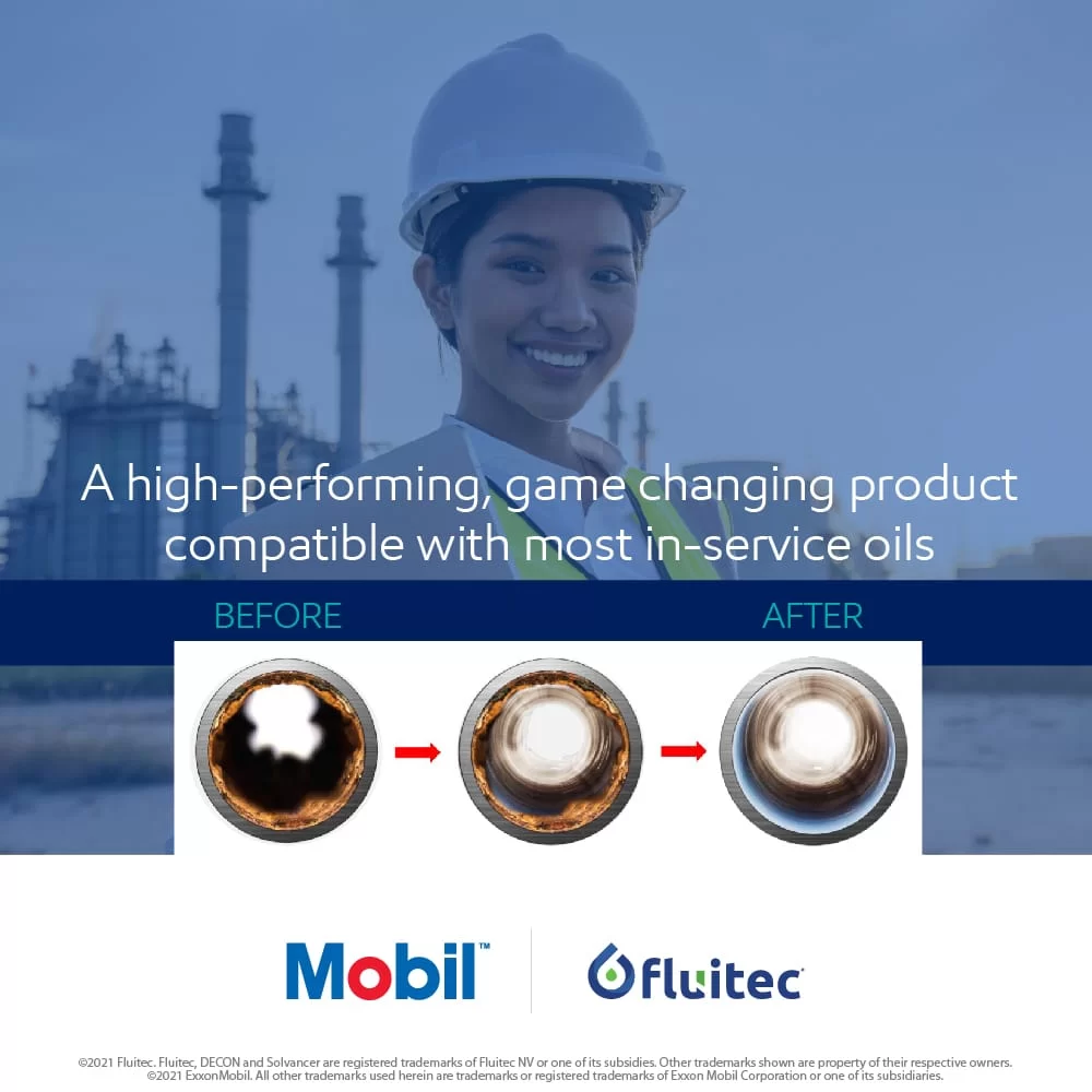 Sarah Parsons, North America Industrial Lubricants Brand Manager, ExxonMobil Fuels & Lubricants Company states, “When operating power generation and petrochemical equipment, maximizing productivity and enhancing reliability is critical to minimizing downtime and driving your bottom line.  That’s why we partnered with Fluitec, the industry’s leading oil enhancement technology company, to develop Mobil Solvancer, a cost-effective cleaner that can help operators dissolve varnish and deposits that can cause long-term harm to systems while keeping their equipment running longer between overhauls. That means less downtime – both planned and unplanned.”