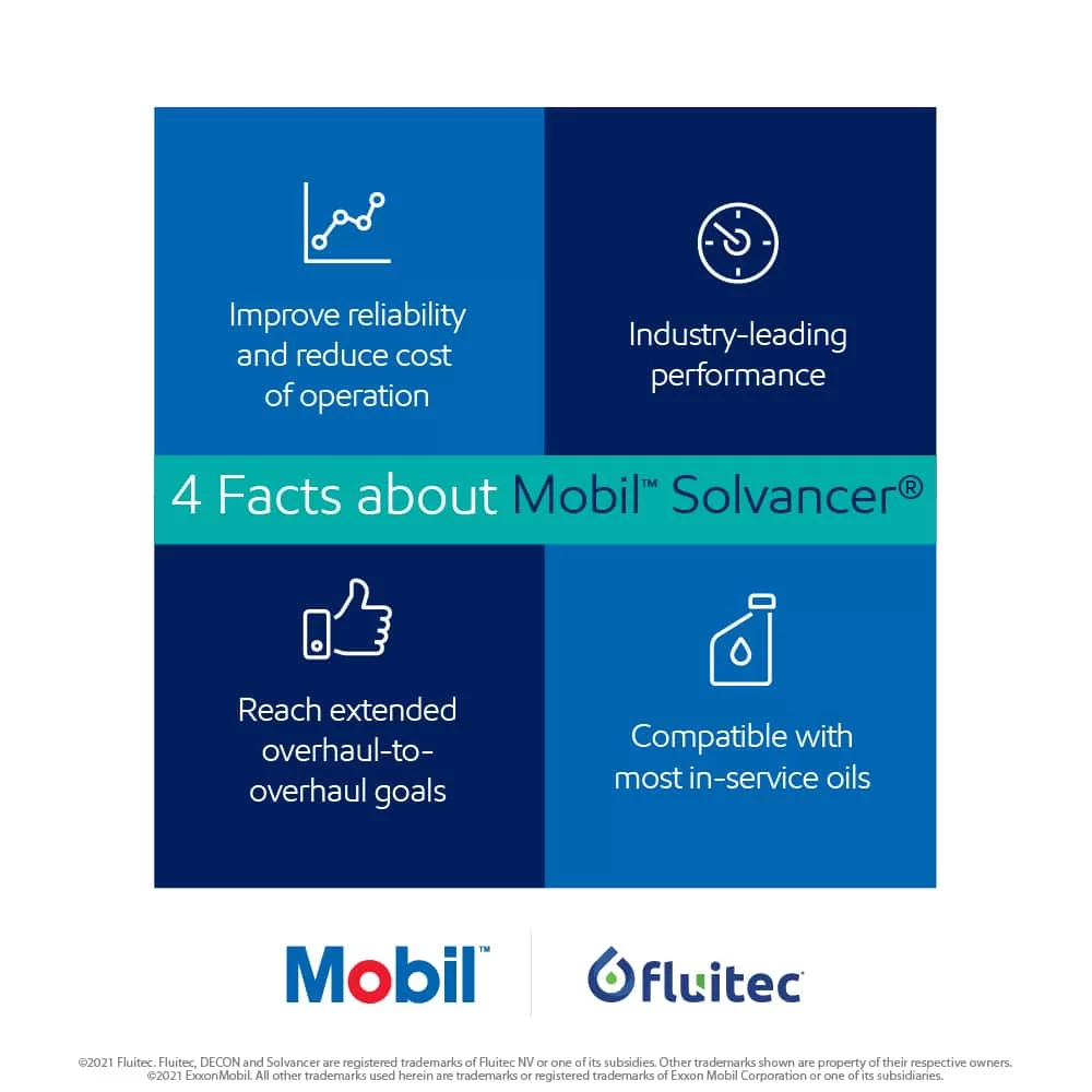 Mobil Solvancer was developed with ExxonMobil based on Fluitec’s DECON technology. This product brings together two major lubrication technology leaders to create a solution for one of the most prevalent challenges to our industry, varnish.