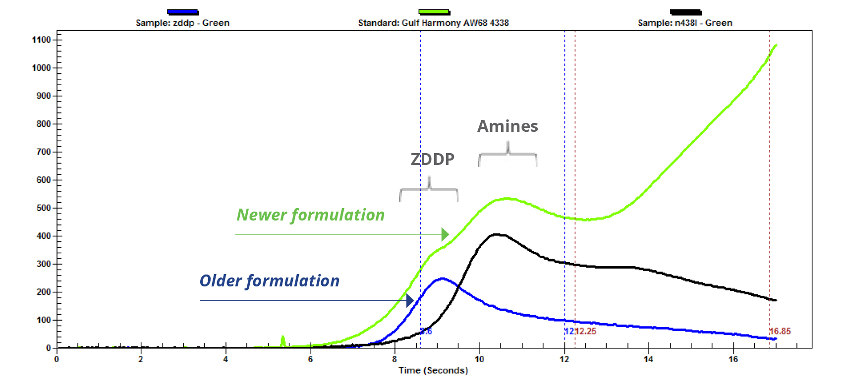 Increased Oxidation Resistance – Primary antioxidants combined with ZDDP allow for improved oxidation resistance. The primary antioxidants improve the fluid’s oxidative resistance while protecting the antiwear additives compared to past formulations where only ZDDP was used as both the antioxidant and antiwear as seen in figure 2 below.