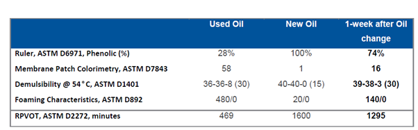 Table 1: Adding new oil to a varnished gas turbine, significantly impacts the quality of the fluid.