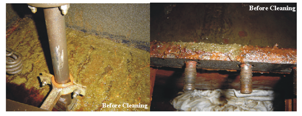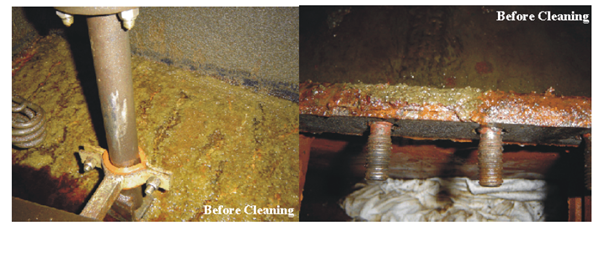 New oil was added to the hydraulic sump of the controllable pitch propeller system in a large ship. Initially, the new oil lasted for 5 years without any degradation of the fluid. After the first oil change, the system was not cleaned and another batch of fresh oil was added. However, this second batch of oil only lasted for 3 years before degradation was noticed. The second batch of oil was changed and a third batch of new oil added to the system. This third batch of oil only lasted for one year before degradation began as shown in figure 1 below. Upon examination of the sump, it was realized that there was a large range of deposits as shown in Figure 2.